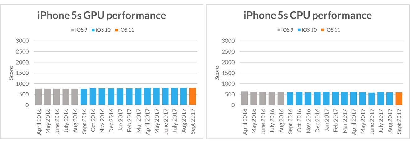 Prvním testovaným zařízením se stal iPhone 5s, jelikož je právě tento iPhone posledním, na který lze nainstalovat iOS 11. Premiéru si odbyl už v roce 2013 a disponuje 64-bitovým procesorem A7. Futuremark využíval pro testování GPU 3DMark Sling Shot Extreme Graphics test a výsledky měsíc co měsíc zaznamenával do tabulky.
