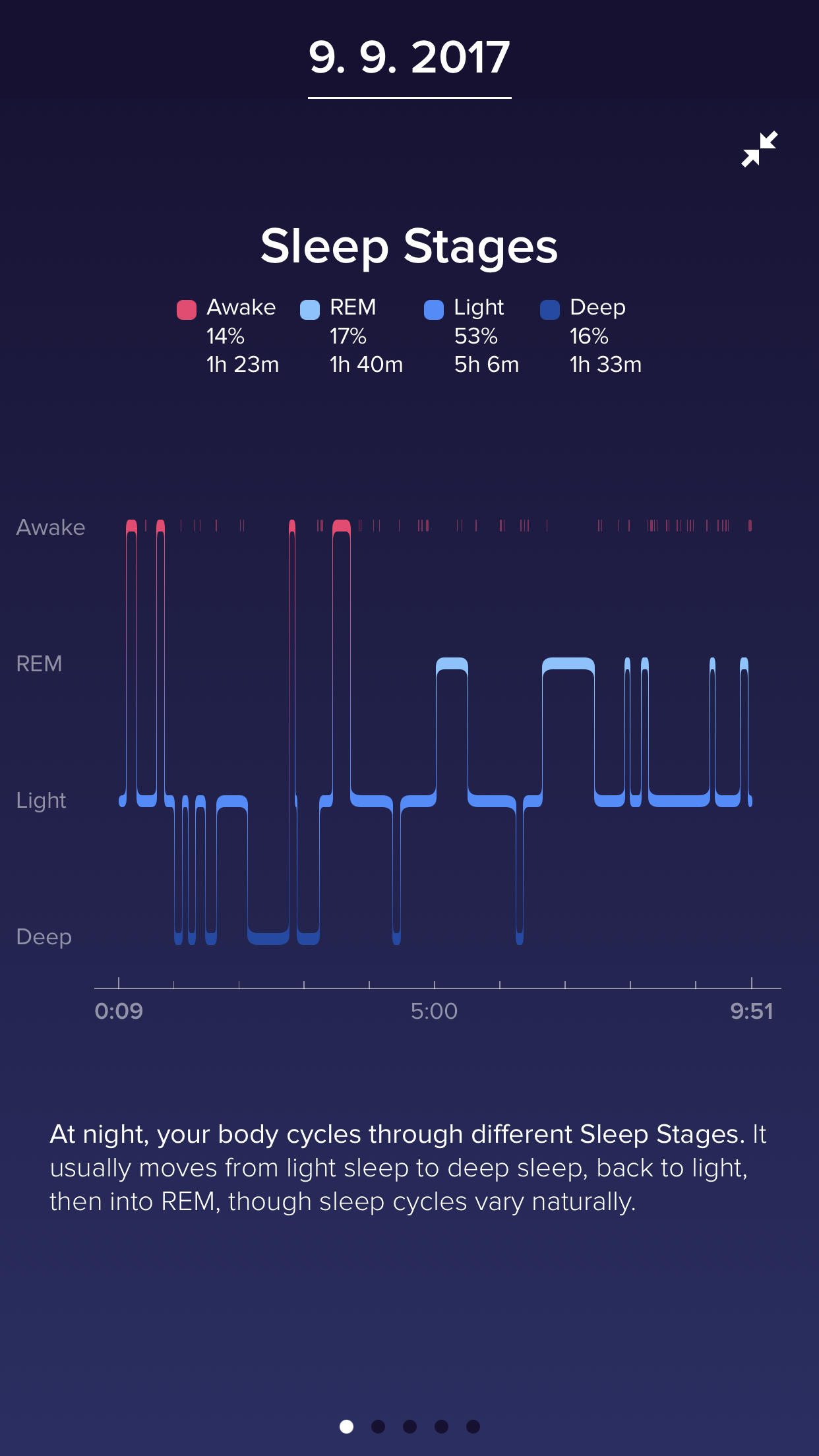 Kromě přesných časů usnutí a probuzení je vám náramek díky snímání srdečního tepu schopný nově změřit, jak kvalitní váš spánek byl. V podrobné analýze totiž vidíte dobu strávenou v určitých fázích spánku, tedy jak dlouho jste byli v REM fázi, kdy jste měli lehký nebo naopak hluboký spánek, a také to, kolikrát a jak dlouho jste byli v noci vzhůru. Analýza je doopravdy detailní a je schopná vám tak i naznačit, že ačkoli chodíte spát včas, tak váš spánek není kvalitní a měli byste něco změnit.