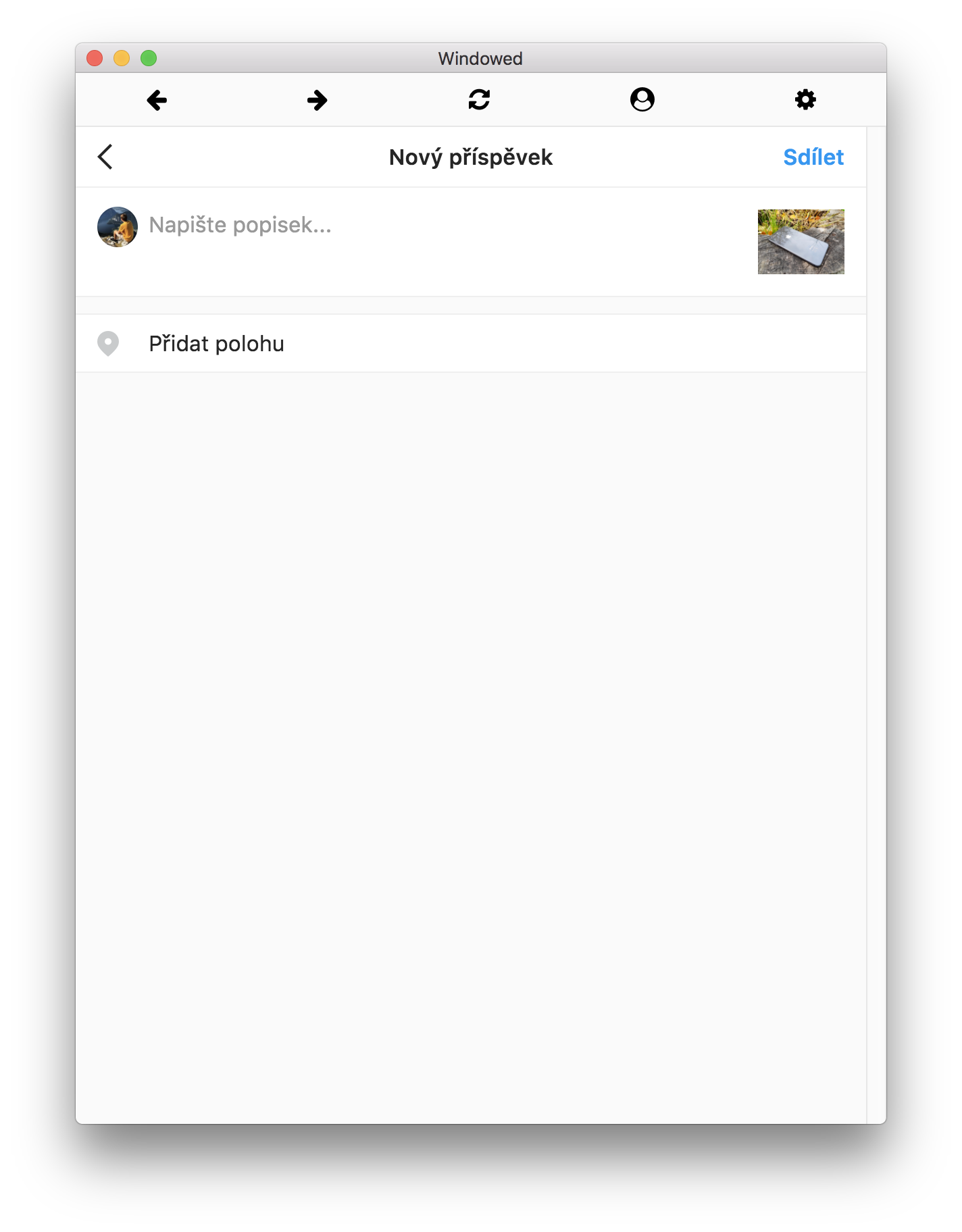 Nečekejte však tak pokročilý editor jako v případě iOS aplikace. Ve Windowed můžete fotografii jen oříznout do rámečku, otočit, přidat k ní popisek, polohu a zveřejnit. Filtry ani další funkce pro úpravu dostupné nejsou, ale spíše než vývojáři za to může samotný Instagram. Windowed se totiž pro síť tváří jako smartphone a proto se Instagram přepne do speciální verze určené pro telefony a umožní tak zveřejňovat fotky. Stejné simulace dosáhnete i skrze záložku Vývojář v desktopovém Safari, ale Windowed přístup k mobilní verzi Instagramu na desktopu výrazně usnadňuje.