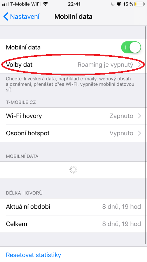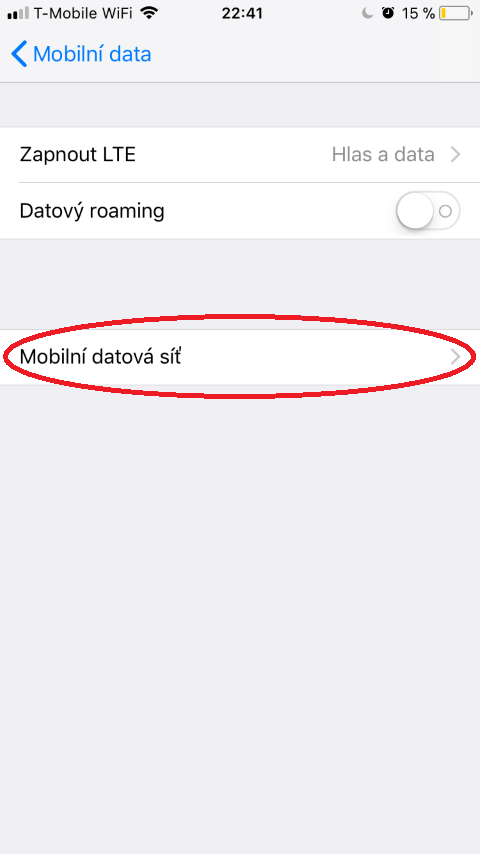 Otevřete Nastavení, následně zvolte Mobilní data a poté Volby dat. Zde si zkontrolujte, jestli se vám zobrazí možnost Mobilní datová síť. Pokud se vám nezobrazí, s největší pravděpodobností máte uzamčený iPhone.