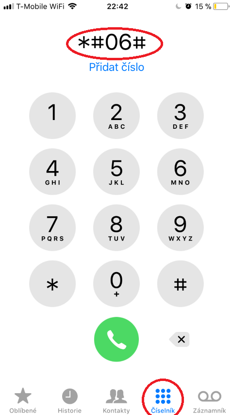 Stačí otevřít aplikaci Telefon a zde Číselník. Stejně jako byste někomu chtěli zavolat, napište do číselníku kód *#06#. Po zadání tohoto kódu se vám ukáže vaše IMEI. Druhá možnost je otevřít Nastavení -> Obecné -> Informace. Tady stačí scrollnout dolů a najít kolonku IMEI.