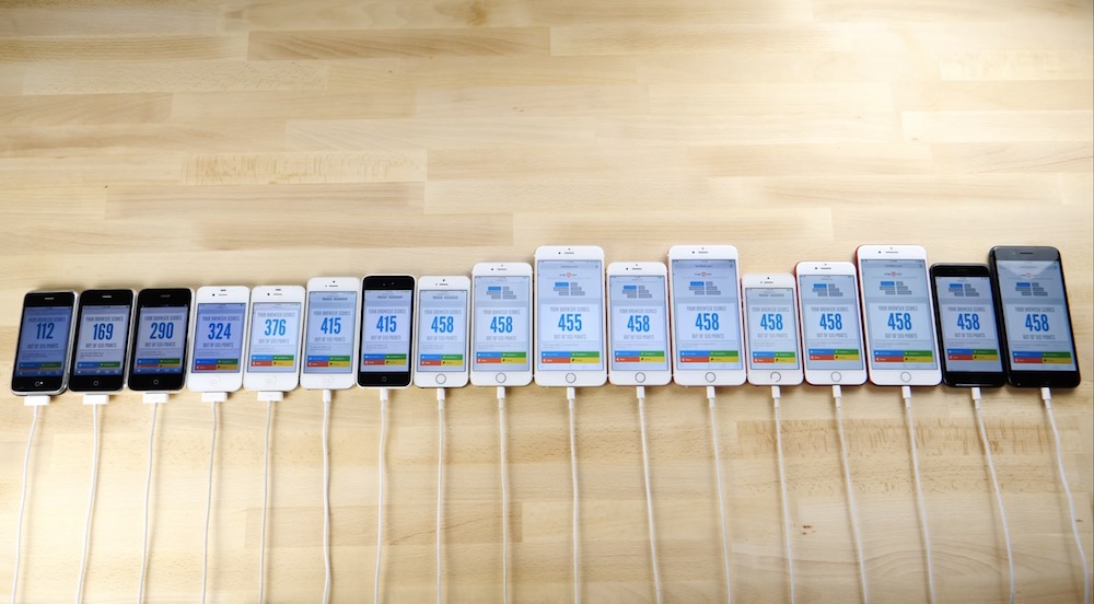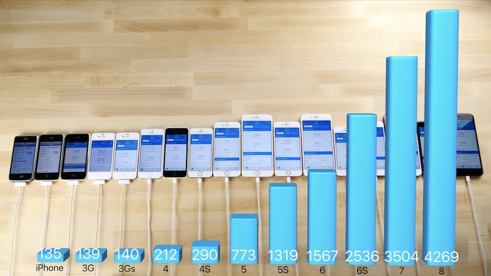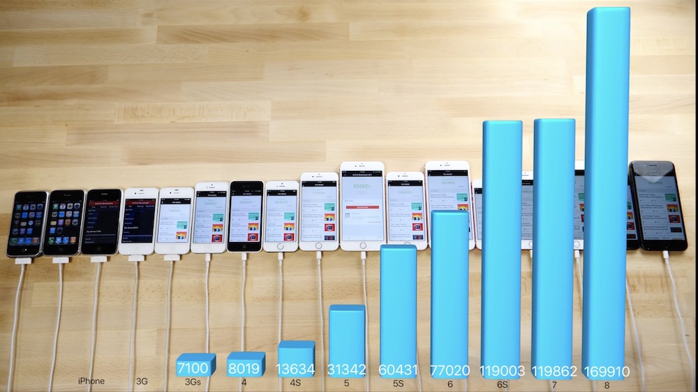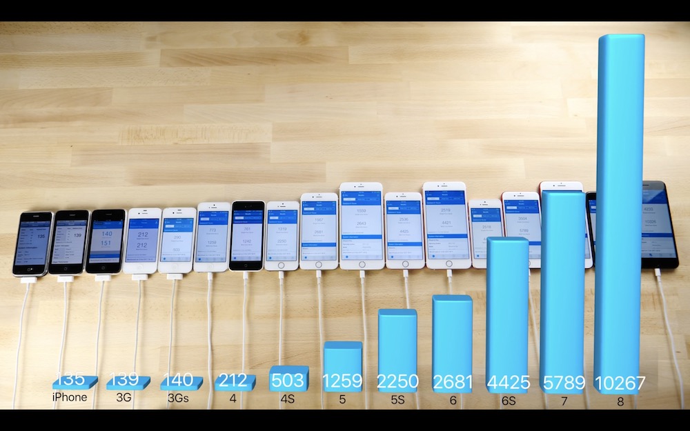 YouTuber nejprve otestoval rychlost zapnutí telefonu kdy svorně vyhrály iPhone 8 a 8 Plus. Dále pak prohnal všechny telefony benchmarkem, přičemž podle slov Applu je iPhone 8 ve srovnání s prvním iPhonem 150krát výkonnější. V benchmarcích iPhone 8 dokazuje, že jeho čip A11 Bionic je skutečně s výrazným náskokem výkonnější i oproti svému předchůdci, a to především v multi-core testu. Zapomínat by se nemělo ani na výkon GPU, kde osmičkové iPhony opět dokazují svou dominanci.