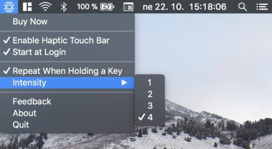 Po nainstalování aplikace, se vám jen přidá ikonka do horního menu baru a tím je hotovo. Skrze ikonu si můžete určit, zda se bude aplikace automaticky zapínat při spuštění Macu, zda se bude haptická odezva opakovat při držení klávesy, zda bude odezva aktivovaná/deaktivovaná, a na závěr i intenzitu odezvy na stupnici od 1 do 4.