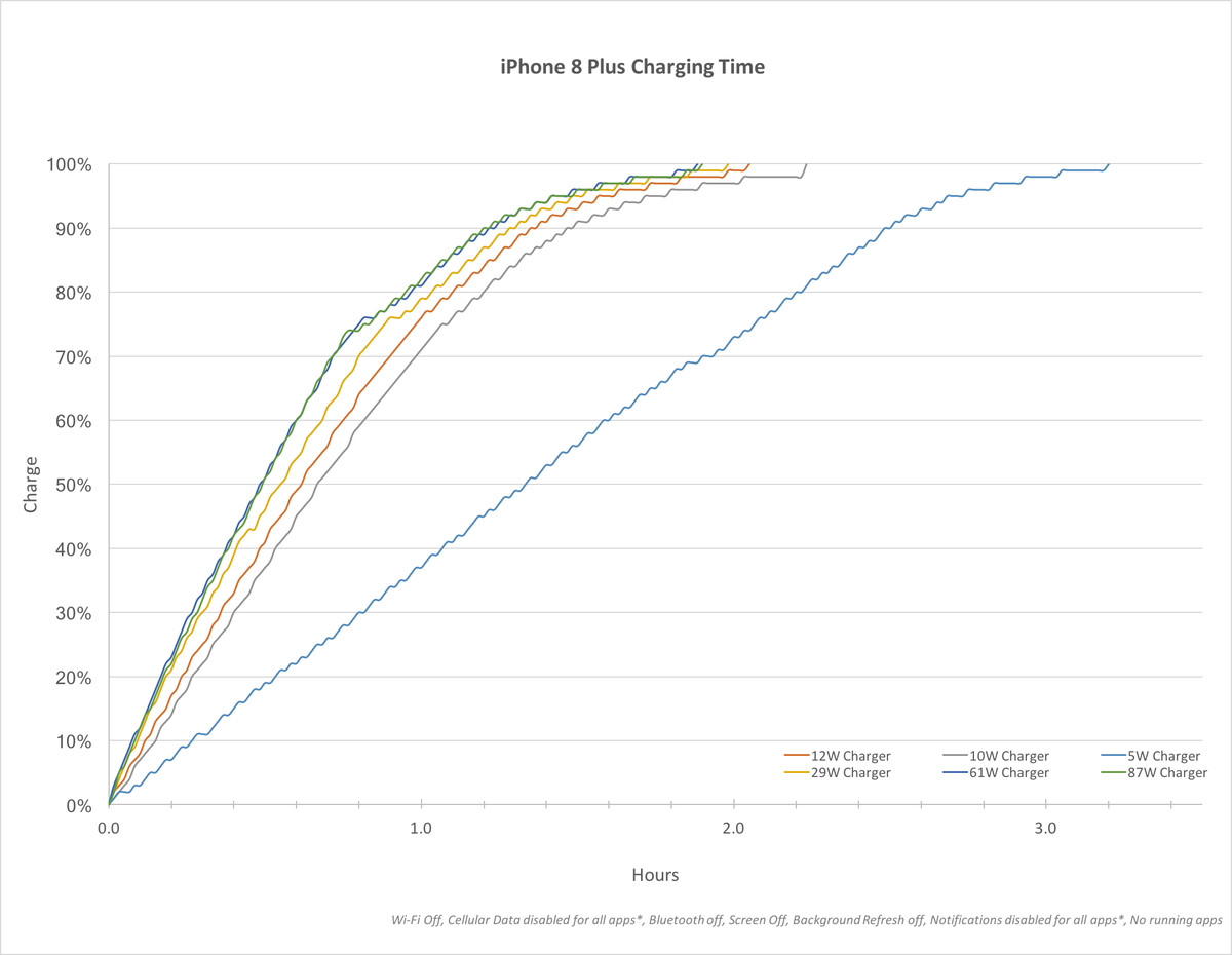 Apple uvádí, že s 29W, 61W nebo 87W adaptérem, které se mimo jiné dodávají k MacBookům Pro a Retina MacBooku, se nové iPhony nabijí na 50 % za 30 minut, což je skutečně pravda. Jenže iPad nabíječka to zvládne za skoro stejný čas, trvá jí to jen o pár minutek více.
