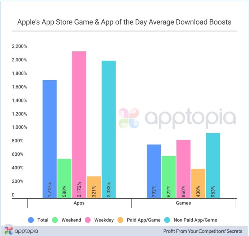 Společnost Apptopia posledních třicet dnů sledovala dění v obchodu s aplikacemi, přičemž zaznamenala velký nárůst stahování. Během pracovních dnů se dokázal počet stahování aplikace zobrazené v sekci App of the Day zvýšit o neuvěřitelných 2 172 %, zatímco u bezplatných her došlo k nárůstu o 963 %.