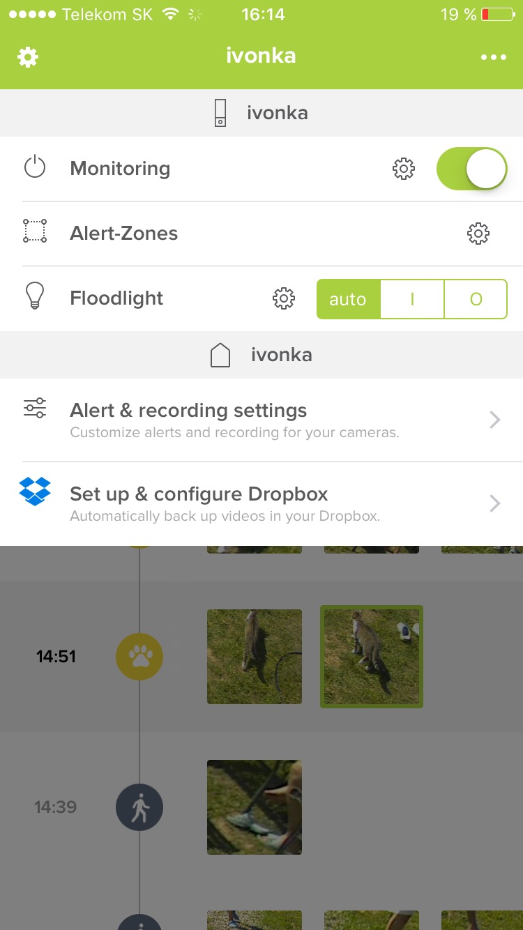 Kamera má slot na micro SD karty na které ukládá záznamy a funguje tak, že je postupně vymazává, paměť je možné rozšířit pomocí karty na 32GB, přičemž 8GB je v balení. Dále se však záznamy ukládají přímo na vaše vlastní FTP a můžete je ukládat také přímo do vašeho Dropboxu. Můžete si zvolit jaké notifikace se mají zasílat na váš telefon a tak například zvířata vás nebudou rušit, ale když k bráně dorazí auto, okamžitě dojde notifikace s fotkou auta a vy si můžete pustit video na kterém uvidíte, co konkrétně dotyčný dělal. Po spuštění aplikace vidíte časovou osu, která ukazuje přesný pohyb zvířat, vozidel a osob včetně času. Vidíte fotografie a můžete is pustit videa. Stejně tak umí kamera dělat časosběrná videa a další záznamy nastavené přesně tak jak vyžadujete.