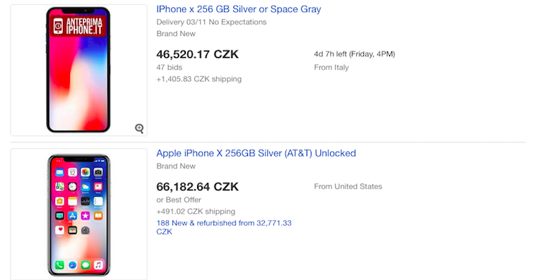 Například na eBay naleznete spousty inzerátů nabízejících iPhone X s kapacitou 64GB a dodáním tento pátek začínajících na zhruba 2000 dolarech, tedy nějakých 44 tisících korun. Ti odvážnější se pak nebojí říci o více než 3500 dolarů a zaúčtovat si nekřesťanských 700 dolarů za dopravu. Najdou se však i takoví experti, kteří si své iPhony X s kapacitou 256GB a potvrzeným dodáním 3. listopadu cení na 12 tisíc dolarů, tedy 264 tisíc korun.