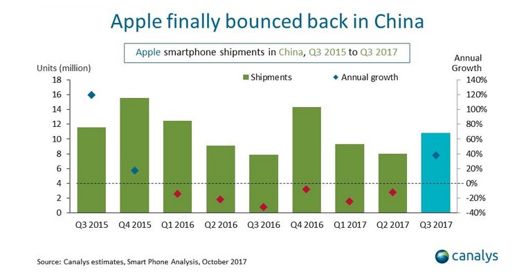 Analytická společnost Canalys naznačuje, že zahájení prodeje iPhonu 8 zvýšilo dodávky iPhonů v Číně o neuvěřitelných 40 %. Podle odhadů analytické firmy se v Číně během období Q3 2017 prodá 11 milionů iPhonů, zatímco za stejné období loňského roku se prodalo pouze 8 milionů jednotek.