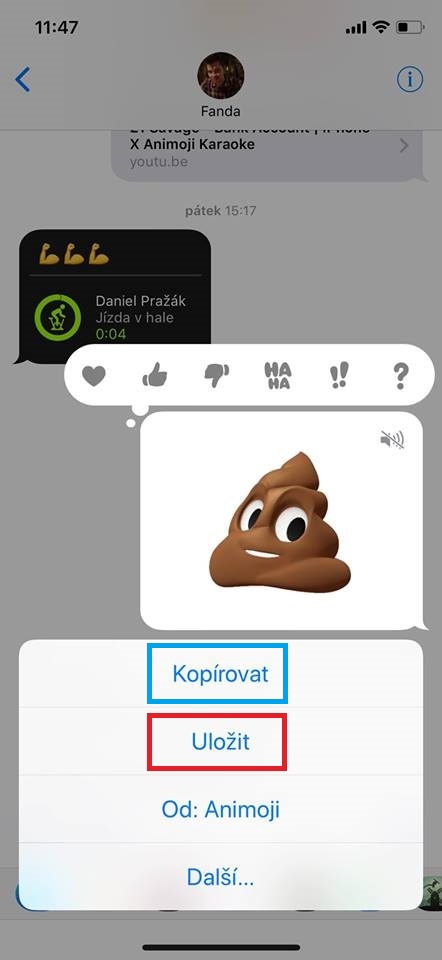 Abyste mohli vaše Animoji převést do formátu GIF, samozřejmě nějaké potřebujete mít. Proto nějaké nahrajte a pošlete například kamarádovi. Poté na Animoji podržte prst a zvolte Uložit nebo Kopírovat. V případě možnosti Uložit se Animoji uloží do aplikace Fotky.