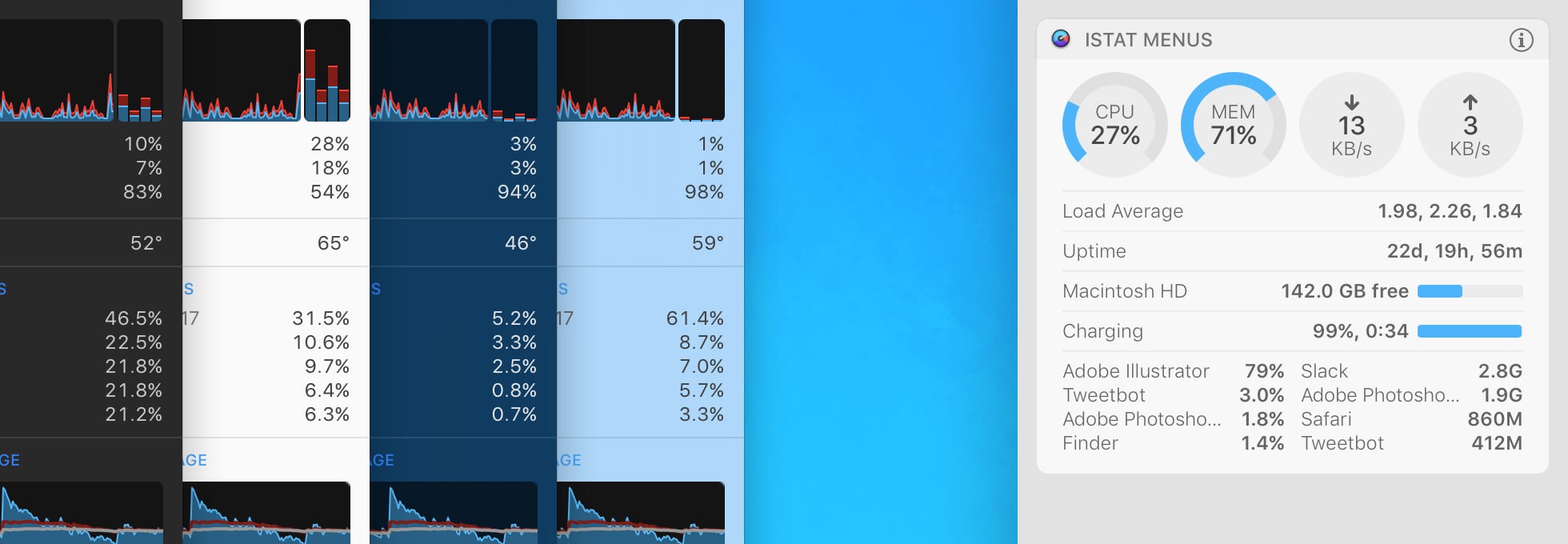 Pokud něco chcete mít ve svém menuBar, pak je to jednoznačně iStat menu, což je jeden z nejstarších a nejpoužívanějších pluginů pro menuBar v rámci MacOS. Aplikace, kterou si pamatuji od chvíle kdy jsme přesedlal před deseti lety z Windows na Mac je přesně tou, kterou si celý rok říkáte zda mít nebo nemít a vždy skončíte u toho, že se vám líbí, ale za plnou cenu zkrátka nestojí. Pokud jste na tom podobně jako já, pak je nyní ta nejlepší chvíle na koupi. iStat menu je totiž nyní o 44% levnější, respektive o 40% v případě multi-user verze. To znamená, že vás plná verze pro jednotlivce vyjde na 11,99$ a pokud se dohodnete s kamarády, tak za multi-user licenci dáte 17,99$. K dispozici jsou slevy také pro ty, jenž chtějí přejít ze starší verze na nejnovější. iStat Menus je integrováno do menu baru macOS a poskytuje uživatelům pohodlný přístup k informacím o systému, jako jsou informace o GPU a CPU, statistiky paměti a rychlosti ventilátoru, teplota, využití disku a výdrž baterie.
