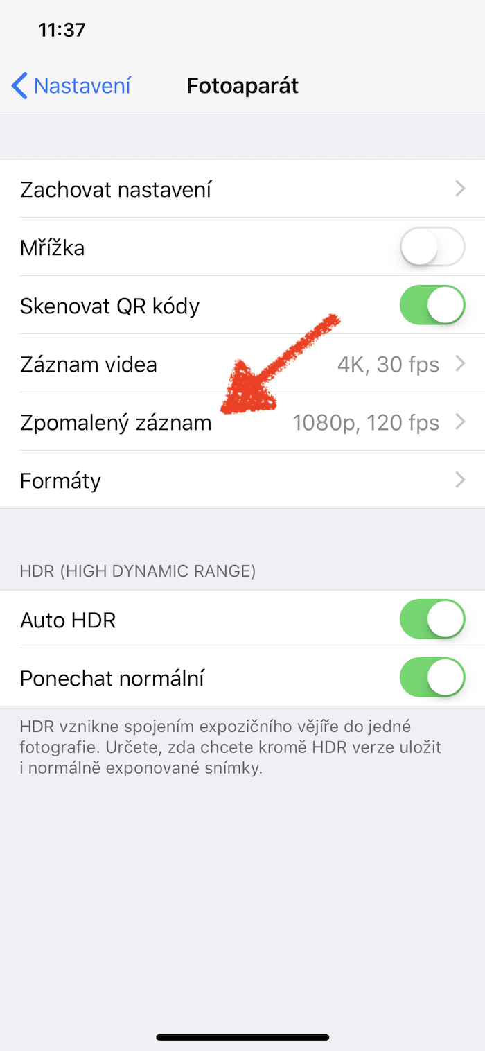 Na vašem iPhonu (8, 8 Plus nebo X) otevřete Nastavení a zde najděte položku Fotoaparát. Po rozkliknutí otevřete možnost Zpomalený záznam a vyberte 1080p HD, 240 fps. Po provedení tohoto nastavení stačí už jen otevřít aplikaci Fotoaparát a vesele začít nahrávat slow-mo záběry. Záběry se uloží do aplikace Fotky v kodeku H.265 ve formátu .MOV.