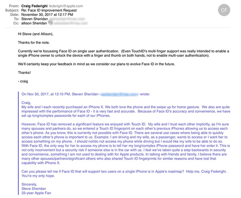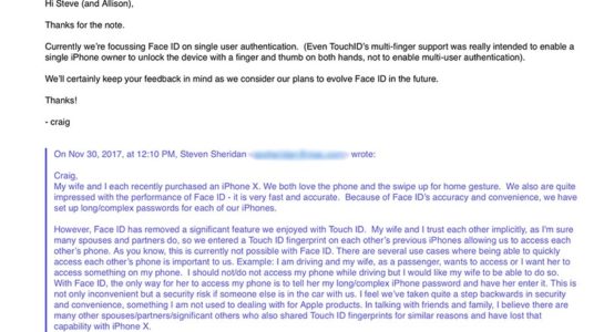Na Redditu se dnes objevil poměrně zajímavý mail, ve kterém se jeden z uživatelů nového iPhonu X ptá Craiga Federighiho, tedy ředitele softwarového inženýrství, zda Apple v budoucnu plánuje přidání podpory druhé tváře, která by mohla nový iPhone X odemykat. Mnoho uživatelů totiž naráží na to, že bylo zvyklé svůj telefon “sdílet” se svými partnery či partnerkami díky otisku prstu, kódový zámek jim však prozrazovat nechtějí. Pokud ale začnou využívat iPhone X a chtějí tento benefit dopřát svým drahým polovičkám i nadále, jiná cesta než prozrazení kódu neexistuje.