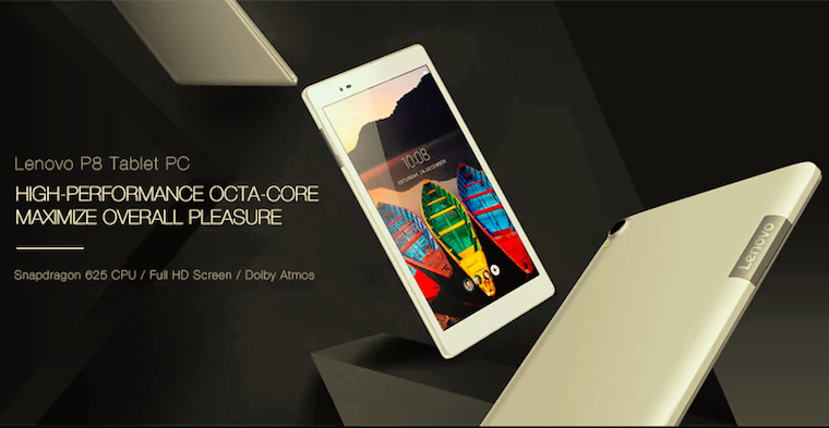 Tablet Lenovo P8 má osmipalcový displej s rozlišením 1920 x 12900 pixelů. Pohání ho osmijádrový procesor Qualcomm Sanpdragon 625 2.0 GHz a kromě úložného prostoru 16GB disponuje slotem pro microSD kartu s kapacitou do 128GB. Tablet má jak přední, tak i zadní fotoaparát, WiFi, Bluetooth, GPS a dva reproduktory s Dolby ATMOS. Na tabletu běží operační systém Android 6.0.
