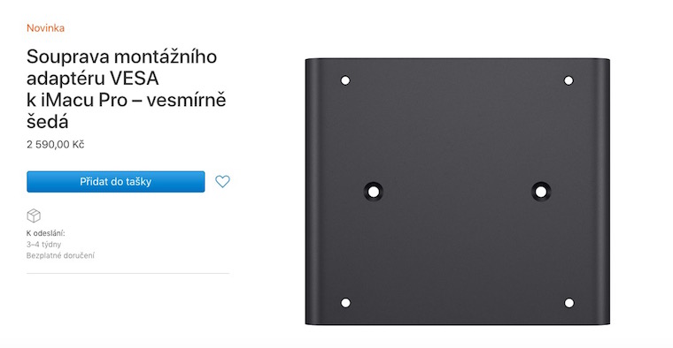 Apple dnes oficiálně spustil prodej iMacu Pro a do eshopu přidal i vesmírně šedou soupravu montážního adaptéru VESA, která obsahuje vše co je potřeba k nahrazení podstavce iMacu Pro montážní konzolou. Souprava stojí 2590 korun a dodání se očekává do 3-4 týdnů. Doručena vám bude vesmírně šedá konzola VESA, příruby VESA, šrouby M4 x 0,7mm, šrouby M2,5 x 0,45mm, Torx klíč, přístupová karta a návod k montáži. Zakoupit jej můžete na tomto odkazu.
