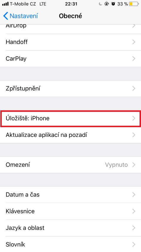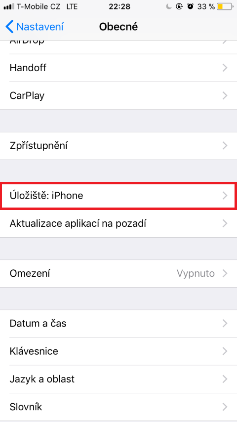Otevřeme Nastavení a přejdeme do možnosti Obecné. Zde klikneme na Úložiště: iPhone a počkáme, než se načte využití úložiště. Vybereme aplikaci, která zabírá hodně místa (doporučuji se dívat především na aplikace, které zabírají více než 500 MB, aby to za to stálo). Aplikaci rozklikneme a zvolíme Smazat aplikaci. Otevře se další dialogové okno, kde opět zvolíme Smazat aplikaci. Tento krok povede k tomu, že se celé aplikace nenávratně vymaže a vy budete nuceni aplikaci stáhnout znova z App Store.