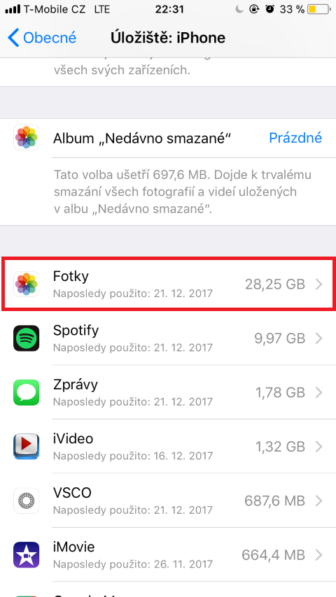 Otevřeme Nastavení a zvolíme možnost Obecné, zde potom Úložiště: iPhone. Počkáme, až se načte využití úložiště a u kolonky Album „Nedávno smazané“ klikneme na modré tlačítko Prázdné. Otevře se nám další dialog, který upozorní na trvalé smazání vybraných položek. Pokud jsme se pro smazání těchto fotek z alba Nedávno smazané definitivně rozhodli, klikneme na Smazat z iPhonu.