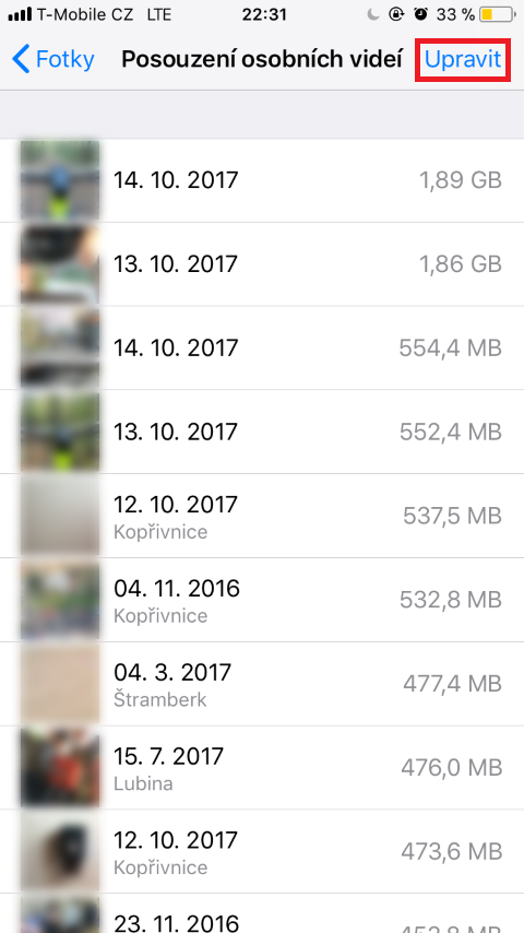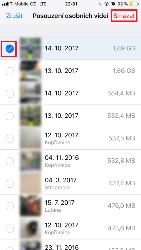 Podíváme se do Nastavení -> Obecné a rozklikneme možnost Úložiště: iPhone. Počkáme, až se načte využití úložiště a poté klikneme na možnost Fotky. Zde swipneme úplně dolů a otevřeme Posouzení osobních videí. Zobrazí se nám veškerá videa, která mají příliš velkou velikost. Pokud některé z videí chceme smazat, klikneme v pravém horním rohu na Upravit, videa ke smazání vybereme a poté klikneme na tlačítko Smazat, které se nachází v pravém horním rohu obrazovky.