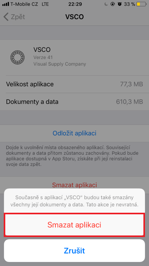 Druhý krok k vyčištění iPhonu spočívá v mazání dat aplikací. Dejme si příklad – používáme aplikaci VSCO na úpravu fotek. VSCO si každou fotku ukládá zvlášť a po delším používání se může stát, že tato aplikace bude zabírat veliké množství dat. Jak tomu předejít?