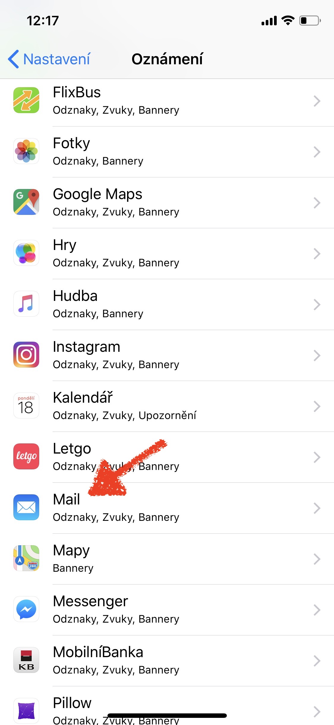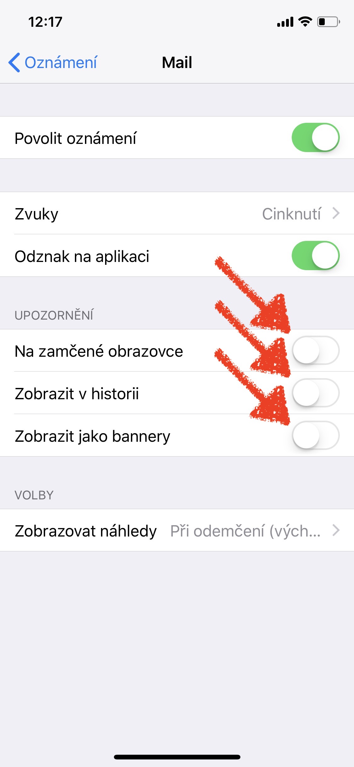 Nyní se vraťte zpět na základní nabídku Nastavení a přejděte do Oznámení –> Mail. Zde zapněte Na uzamčené obrazovce, Zobrazit v historii a Zobrazit jako bannery.