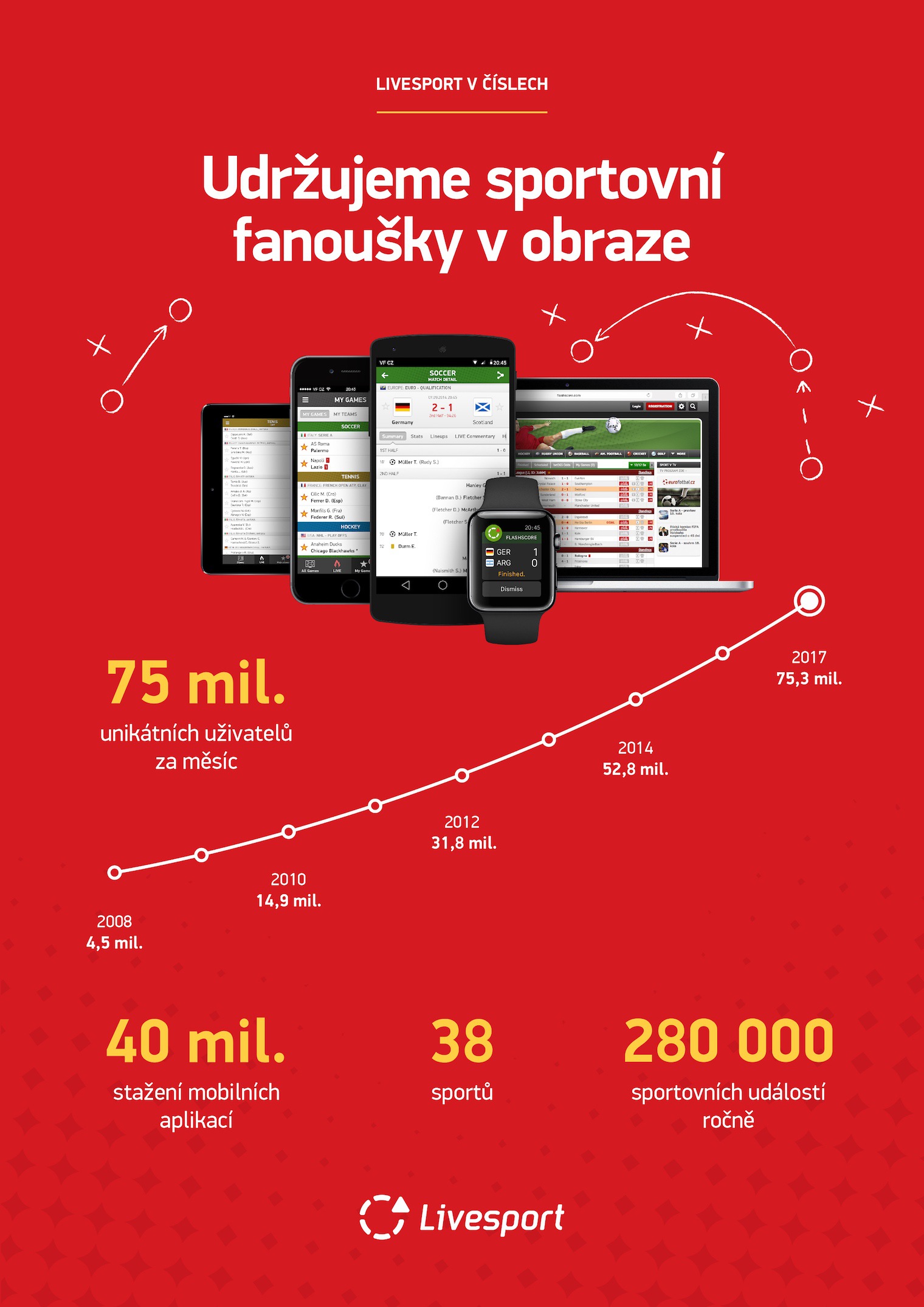 Vývojáři přední české technologické společnosti Livesport slaví další úspěch. Jejich aplikace s krátkým sportovním zpravodajstvím má ve svých mobilních zařízeních již přes 40 miliónů sportovních fanoušků z celého světa. Čeští sportovní nadšenci ji znají jako Livesport, anglicky mluvící fanoušci zase jako FlashScore a například v Itálii boduje pod jménem Diretta. Řeč je o aplikacích s výsledky, statistikami a dalšími informacemi z téměř čtyřiceti sportů, které společnost Livesport vydává pro iOS a Android ve více než 30 jazykových verzích.