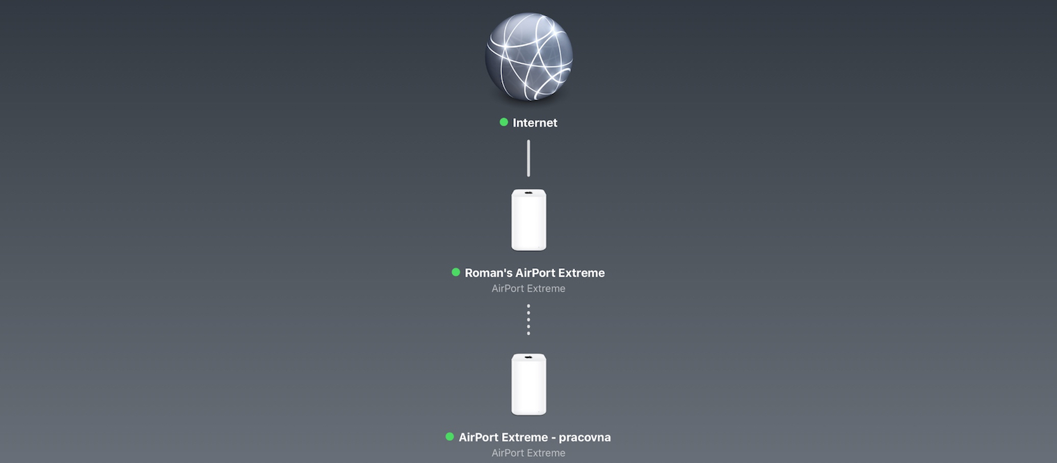 Moje síť tedy vypadá tak, že mi ze zdi vede ethernet kabel od providera do AirPort Extreme, který internet rozesílá pomocí Wi-Fi do zbytku bytu. Zároveň je na něj přes kabely připojen PlayStation, Televizor a také disk. V pracovně mám pak druhý AirPort Extreme, který je nastaven jako Extender Wi-Fi a prodlužuje tedy signál. Zároveň k němu mám pomocí ethernet kabelu připojen iMac, který má vypnutý Wi-Fi modul a připojuje se pomocí AirPortu Extreme, který slouží jako jeho anténa. Díky tomu je v celém bytě vysokorychlostní Wi-Fi síť 802.11.ac, ke které se připojují iPhony, iPady a Macbooky a zároveň jsou všechny nepřenosné zařízení připojeny kabelem přímo k AirPortům.