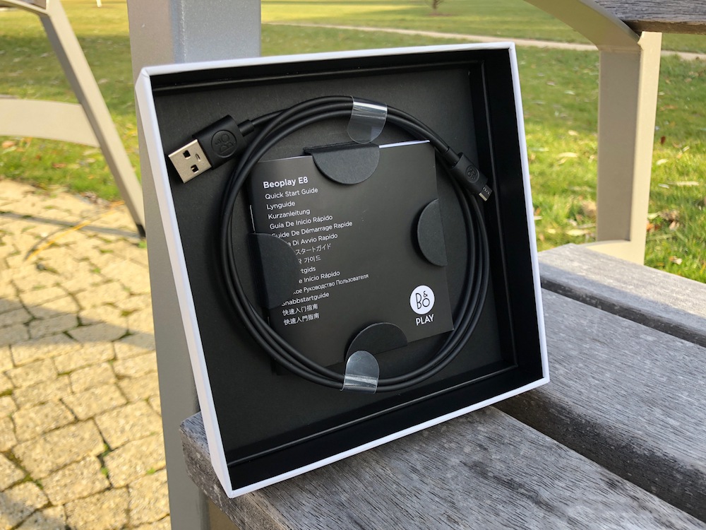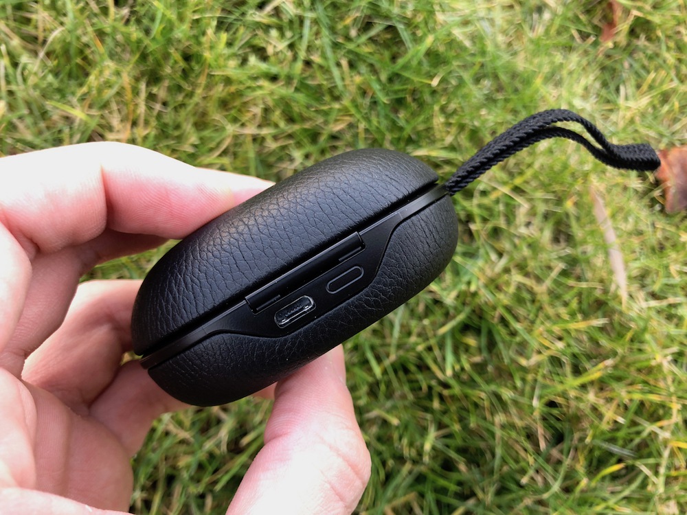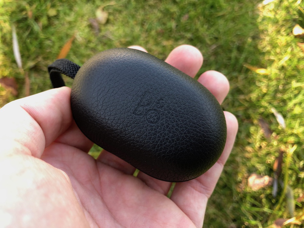 Podobně jako k AirPodům, i k BeoPlay E8 dostanete nabíjecí pouzdro. Bang & Olufsen se jej rozhodl pojmout o něco elegantněji, a tak je pouzdro potaženo kůží. Na jeho straně je uchyceno gumové poutko a vzadu se pak nenápadně skrývá micro-USB port a dvě diody informující o aktuálním stavu během nabíjení. Pouzdro je vybaveno baterií o kapacitě 365 mAh a zvládne tak sluchátka nabít plně dvakrát, což přesně odpovídalo i při reálném testování. Z úplného vybití se sluchátka na 100 % nabijí přesně za hodinu a čtvrt. Plné dobití poznáte tak, že dioda uvnitř pouzdra přestane blikat. Samotné pouzdro se pak skrze přiložený micro-USB kabel (dlouhý 1,2 metru) nabije na 100 % přibližně za hodinu a tři čtvrtě.