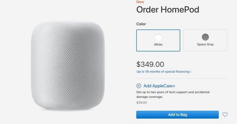 HomePod je k dispozici ve dvou barevných variantách, a to vesmírně šedé a bílé. Ve Spojených státech se prodává za 349 amerických dolarů, v Austrálii za 499 australských dolarů a ve Velké Británii za 319 liber.