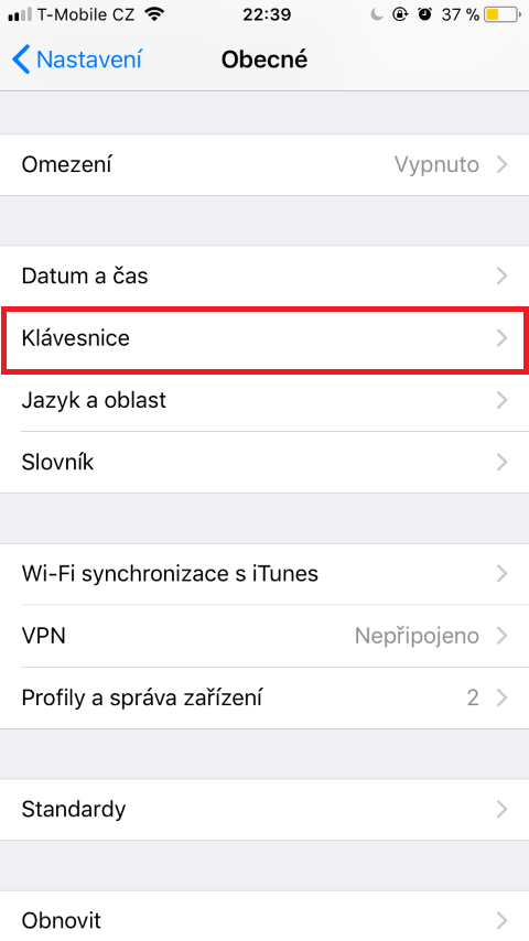 Abychom vypnuli doplňování velkých písmen, musíme přejít do Nastavení. Poté přejdeme do kolonky Obecné a zde najdeme a rozklikneme možnost Klávesnice. Tady lokalizujeme funkci Auto velká písmena a pomocí slideru ji vypneme.