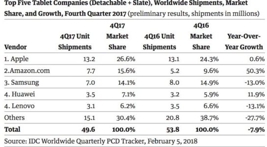 V roce 2017 prodal Apple celkem 43,8 milionů iPadů, což je zhruba dvakrát více, než co prodal konkurenční Samsung a Amazon dohromady. Tyto společnosti totiž prodaly 24,9, respektive 16,7 milionů tabletů. Kdybychom se pak na situaci na trhu podívali skrze procenta, Apple si na něm drží podíl neskutečných 26,8 %. To znamená, že každý čtvrtý prodaný tablet v loňském roce byl právě ten s nakousnutým jablkem na zádech. Oproti roku 2016 pak vzrostl podíl Applu o slušných 2,5 %.