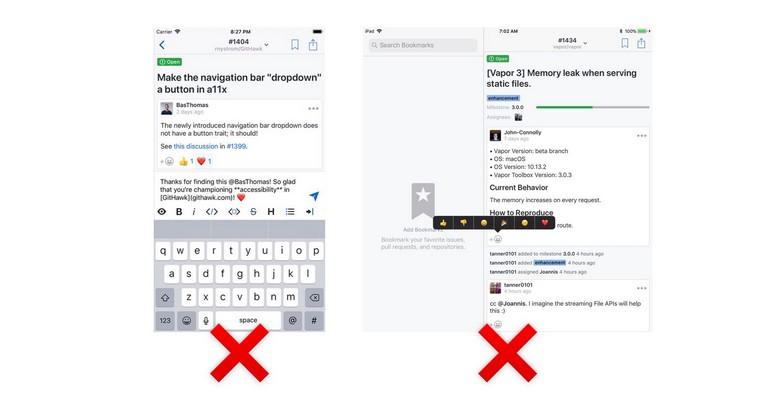 Podobným problémům čelila také aplikace GitHawk, kterou Apple opět odmítl kvůli tomu, že aplikace používala emoji jako média. Vývojář a softwarový inženýr Ryan Nystrom vysvětlil, že po odstranění emoji byla aplikace schválena.