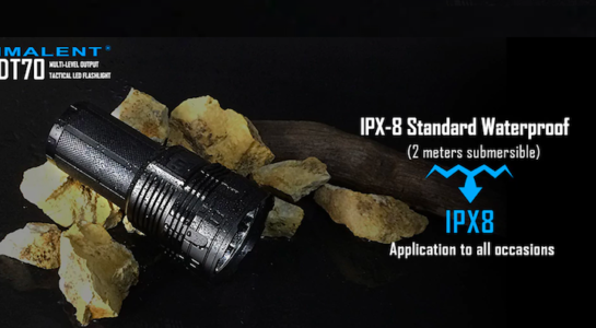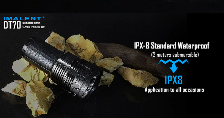 Taktická kapesní svítilna Imalent DT70 se může pochlubit opravdu úctyhodným výkonem, skvělou odolností a nabídkou řady užitečných funkcí. Tato nabíjecí LED svítilna nabízí výkon až 9000 lumenů a dosvit na vzdálenost až 1000 metrů. Součástí balení jsou čtyři nabíjecí li-ion baterie o kapacitě 3000 mAh, které můžete dobíjet přímo v baterce přes Micro USB port. Svítilna dále disponuje chytrým OLED displejem, zobrazujícím nejrůznější parametry. Baterka vydrží ponor do hloubky až 2 metry, pyšní se krytím IPX-8 a disponuje detektorem přehřátí. Imalent DT70 nabízí různé režimy svícení (vysoká, střední i nízká intenzita, SOS mód, Strobo, Turbo).