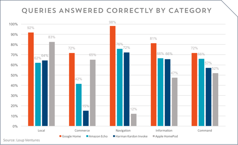 Podle testů je Siri vhodná spíše na lokální a komerční dotazy. Vůbec nemá problémy s tím, aby vám našla nedalekou kavárnu, nebo pomohla s nákupem obuvi. V této oblasti je Siri před Alexou a Cortanou, nicméně stále za Google Assistantem.