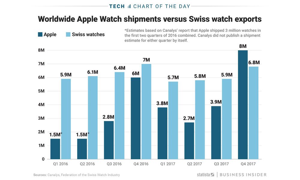 Canalys porovnal údaje, které nedávno prozradil Apple ve své finanční zprávě, s údaji získané od Federace švýcarských hodinářů, díky čemuž tak mohli výzkumníci vytvořit poměrně zajímavý obrázek dnešního trhu.