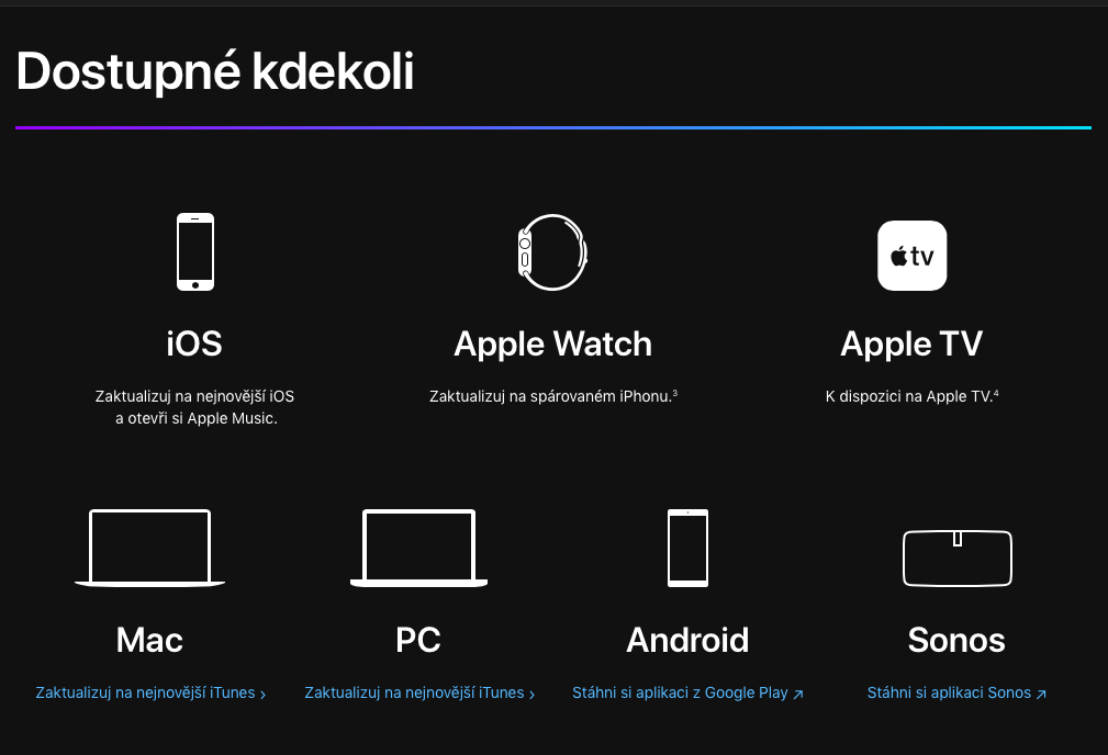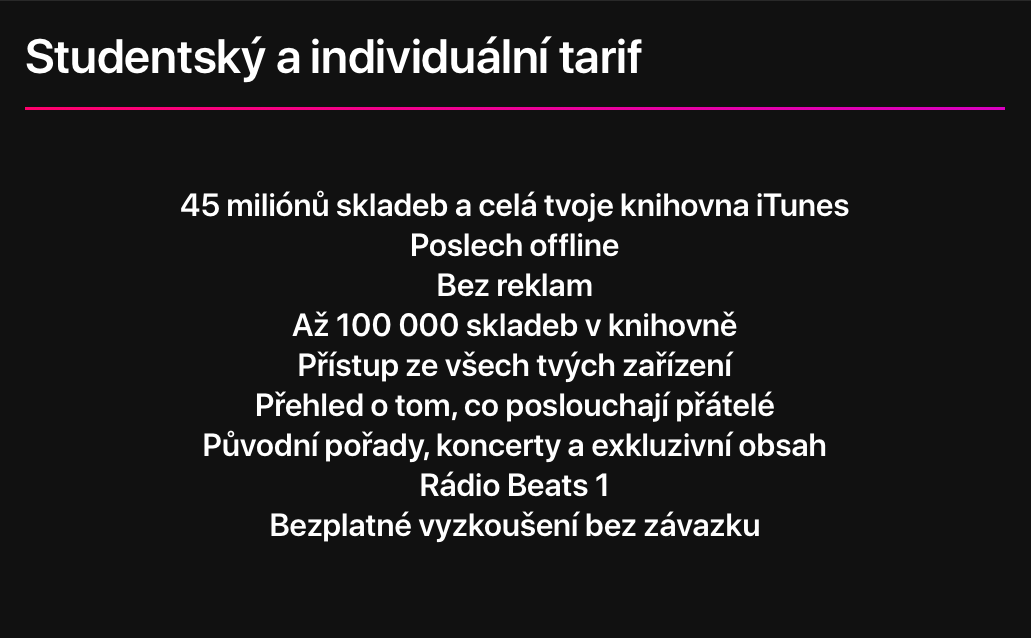 Je poměrně zvláštní, že ačkoliv je studentský tarif nabízen na oficiální stránce Applu a i na americké stránce podpory, česká podpora ji ve svém seznamu zatím neuvádí. Jelikož je však tento tarif v nabídce už i v Apple Music, neměl by být s jeho aktivací problém. Pokud byste však přeci jen nad něčím tápali, mrkněte na návody na české stránce podpory.