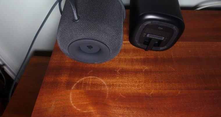 Recenzent Mike Prospero z portálu Tom’s Guide měl s bílým kruhem pod HomePodem také problém. Když však svou dřevěnou polici, na které měl vedle HomePodu položený i reproduktor Sonos One, zkoumal z větší blízkosti, všiml si, že se bílých fleků nevyhnul ani reproduktor Sonos One. I jeho “nožky” totiž na nábytku s olejovým nátěrem zanechaly viditelné stopy. Detailněji si můžete jeho stopy prohlédnout na obrázku pod tímto článkem.