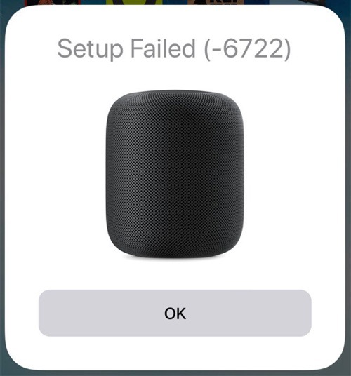 Většinou se jedná o chybu s číselným označením -6722, avšak u některých uživatelů se při nastavování HomePodu zobrazí pouze bílá obrazovka. Problémy jsou způsobené nastavením HomeKit. Apple se snažil situaci urychleně vyřešit, a proto vydal podpůrný dokument, v němž popisuje, jak problémy s instalací vyřešit.