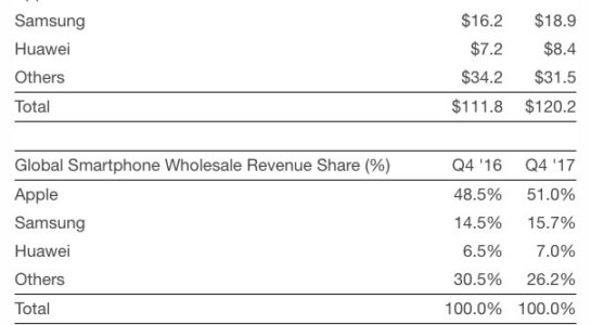 Výzkumná firma Strategy Analytics odhaduje, že Apple měl třikrát vyšší tržby než konkurenční Samsung a sedmkrát vyšší než čínský konkurent Huawei. Apple měl největší tržby z prodeje iPhonů, a to především kvůli vysoké poptávce po iPhonu X, což je nejdražší iPhone v historii kalifornského giganta.