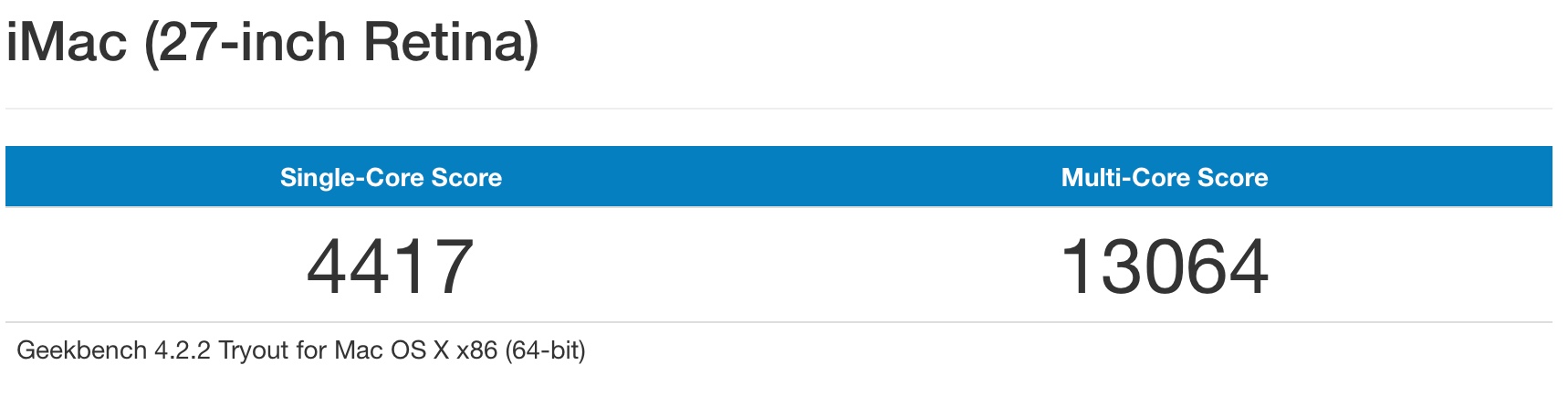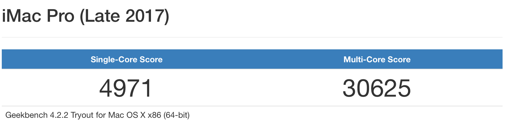 Výsledky měření benchmark testu Geekbench na počítači iMac Pro v konfiguraci Intel Xeon W 3,2Ghz , 32 GB 2666MHz RAM, 1TB Flash disk a Radeon Pro Vega 56 s 8 GB paměti HBM2. Kompletní výsledky testu včetně výsledků v jednotlivých procesech si můžete prohlédnout přímo zde.