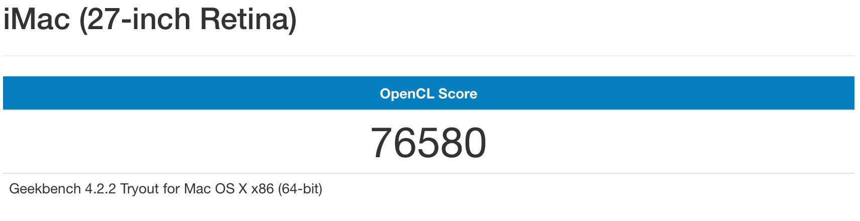 Výsledky měření benchmark testu Geekbench Compute, který měří výkon GPU na počítačiiMac 5K 27″ v konfiguraci Intel Core i5 3,5Ghz, 32GB RAM, 256GB Flash disk a AMD Radeon R9 M290X 2048 MB. Kompletní výsledky testu včetně výsledků v jednotlivých procesech si můžete prohlédnout přímo zde.