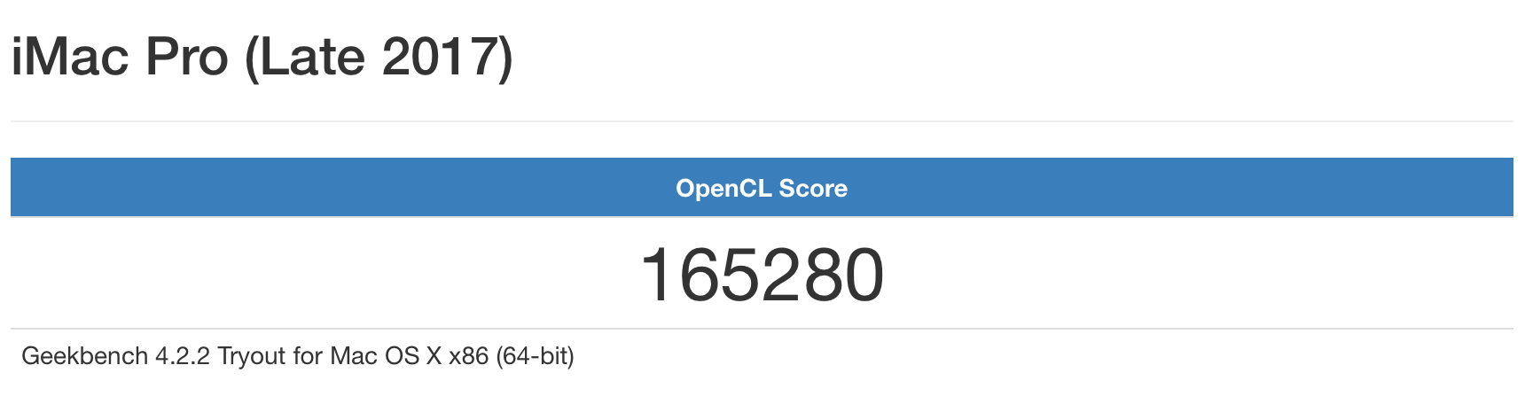 Výsledky měření benchmark testu Geekbench Compute, který měří výkon GPU na počítači iMac Pro v konfiguraci Intel Xeon W 3,2Ghz , 32 GB 2666MHz RAM, 1TB Flash disk a Radeon Pro Vega 56 s 8 GB paměti HBM2. Kompletní výsledky testu včetně výsledků v jednotlivých procesech si můžete prohlédnout přímo zde.