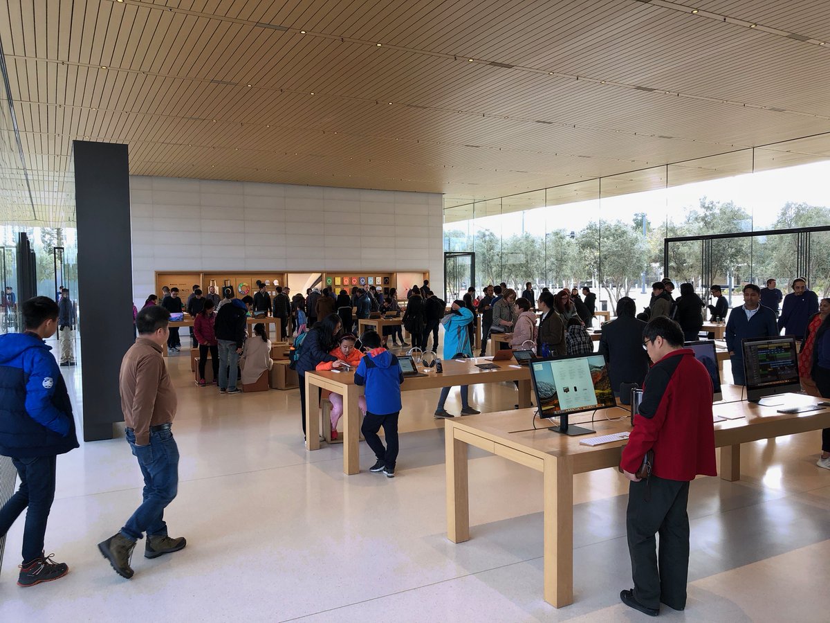 Při příchodu do samotné budovy jsou pak všechny dveře opatřeny čidly pro automatické otevírání, které bez problému zachytí i zákazníka sedícího na invalidním vozíku. Po vstupu do budovy se pak octnete ve velmi rozlehlém prostoru, který návštěvníky na invalidním vozíku či s jiným pohybovým postižením nikterak nelimituje. Obecně se dá říci, že žádné alternativní cesty, které jsou určeny pouze pro návštěvníky na vozíku, Apple do obchodu vůbec neumístil. Všude, kam se dá dojít po vlastních nohou, totiž bez problému dojedete i na vozíku. Dokonce i produkty či další věci, které Apple v návštěvnickém centru vystavuje či prodává, jsou ve výšce, která je snadno dostupná i z vozíku. Ať už se jedná o produkty či hasící přístroj, není problém na ně dosáhnout.