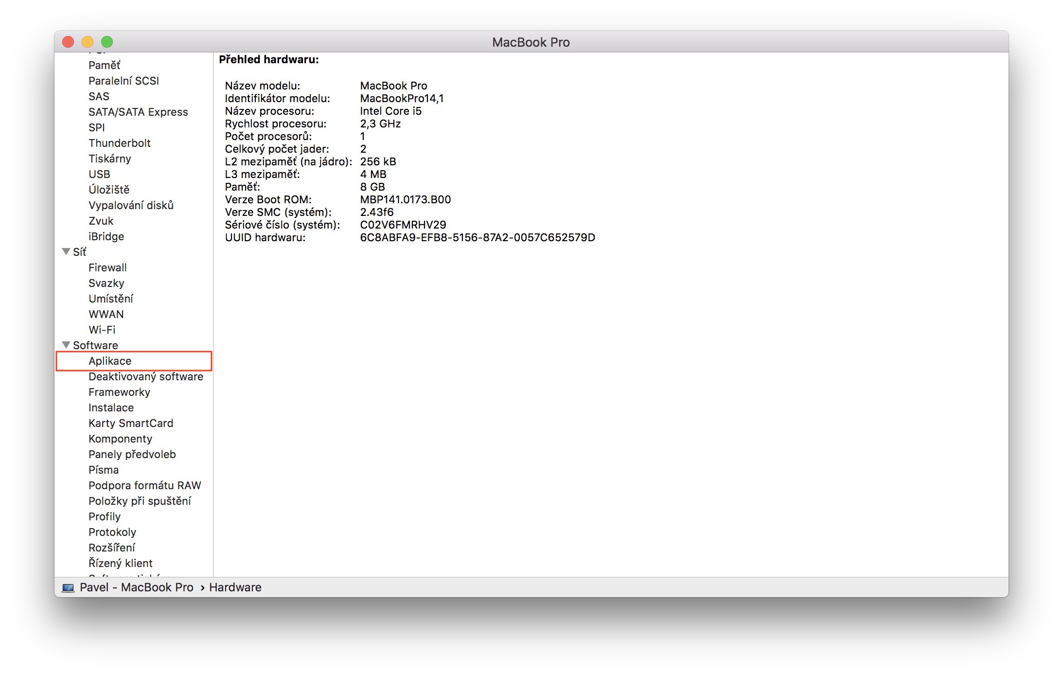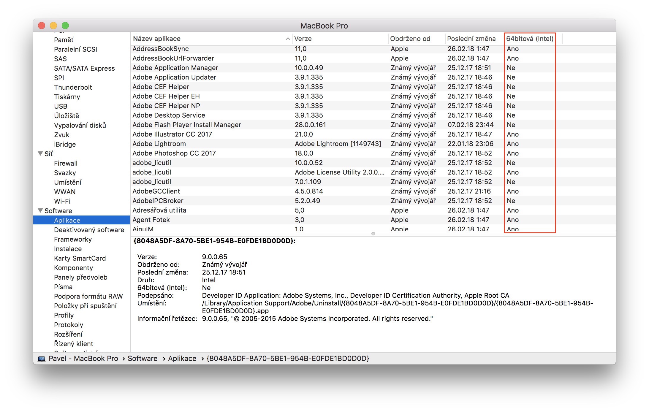 Nejjednodušší cesta ke zjištění, které aplikace jsou 32-bitové, je skrze utilitu v Informacích o systému. Do informací o systému se dostaneme tak, že budeme na klávesnici držet tlačítko Option ⌥ a zároveň se stisknutým tlačítkem klikneme na logo Applu, které se nachází v levém horním rohu obrazovky. Se stále stisknutou klávesou Option klikneme na první možnost – Informace o systému… V utilitě Informace o systému v levém menu najdeme položku Aplikace (nachází se pod skupinou Software), kterou rozklikneme. Zobrazí se nám veškeré aplikace, které běží na našem zařízení. Zda-li určité aplikace pracují na 64-bitové architektuře zjistíte ve sloupečku 64bitová (Intel). Pokud se v tomto sloupci u určité aplikace nachází „Ano“, tak je tato aplikace 64-bitová. Pokud se ve sloupci nachází „Ne“, aplikace pracuje na 32 bitech.