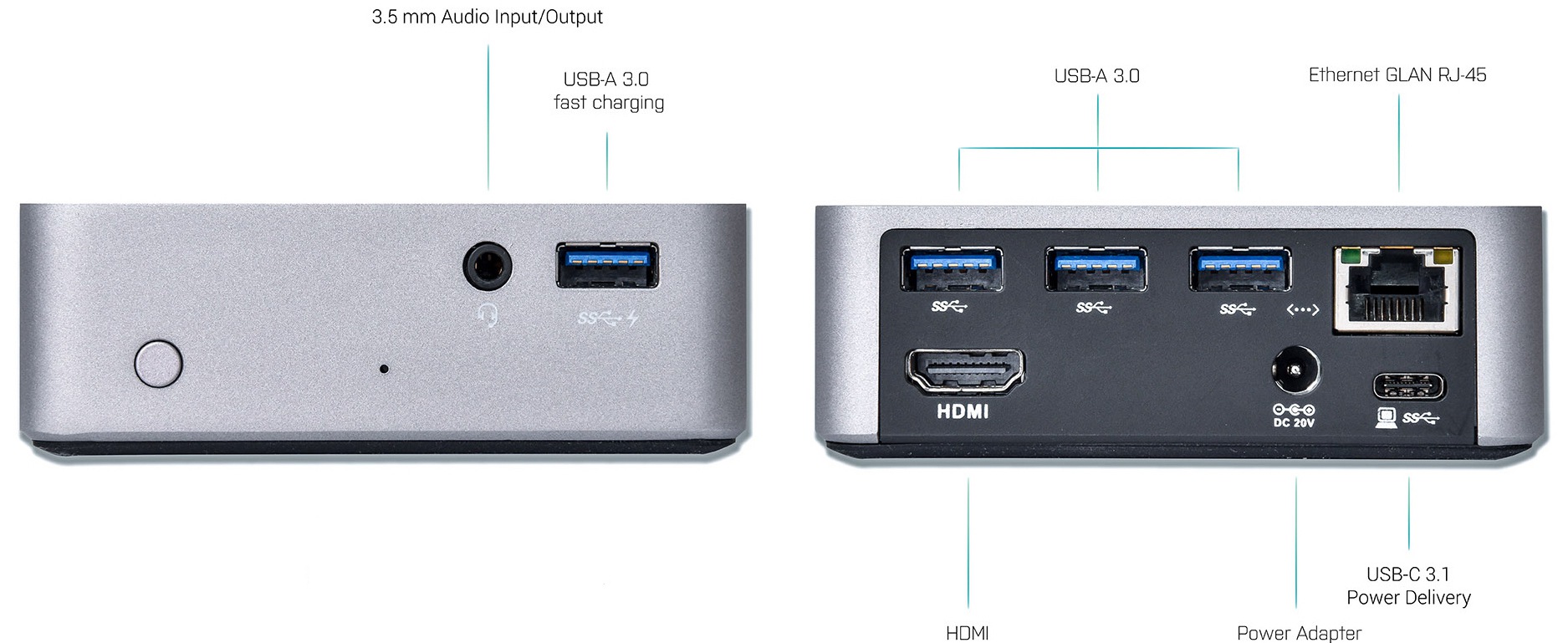 Dock, který se nám dostal do rukou, patří v portfoliu značky mezi ty vybavenější. Stanice je kvádrového tvaru. Její hliníkové šasi, působící elegantním dojmem, je přerušeno jen gumovým podstavcem, který má protiskluzovou funkci. Vzadu je stanice osazena trojicí klasických USB 3.0 portů, 1x HDMI, 1x Gigabit Ethernet portem, 1x USB-C a jedním vstupem pro napájení. Přední část pak zdobí jeden USB 3.0 port s podporou rychlého nabíjení BV 1.2 (například pro iPhone či iPad), dále 3,5mm jack pro sluchátka, dioda a nakonec tlačítko pro zapnutí/vypnutí stanice.