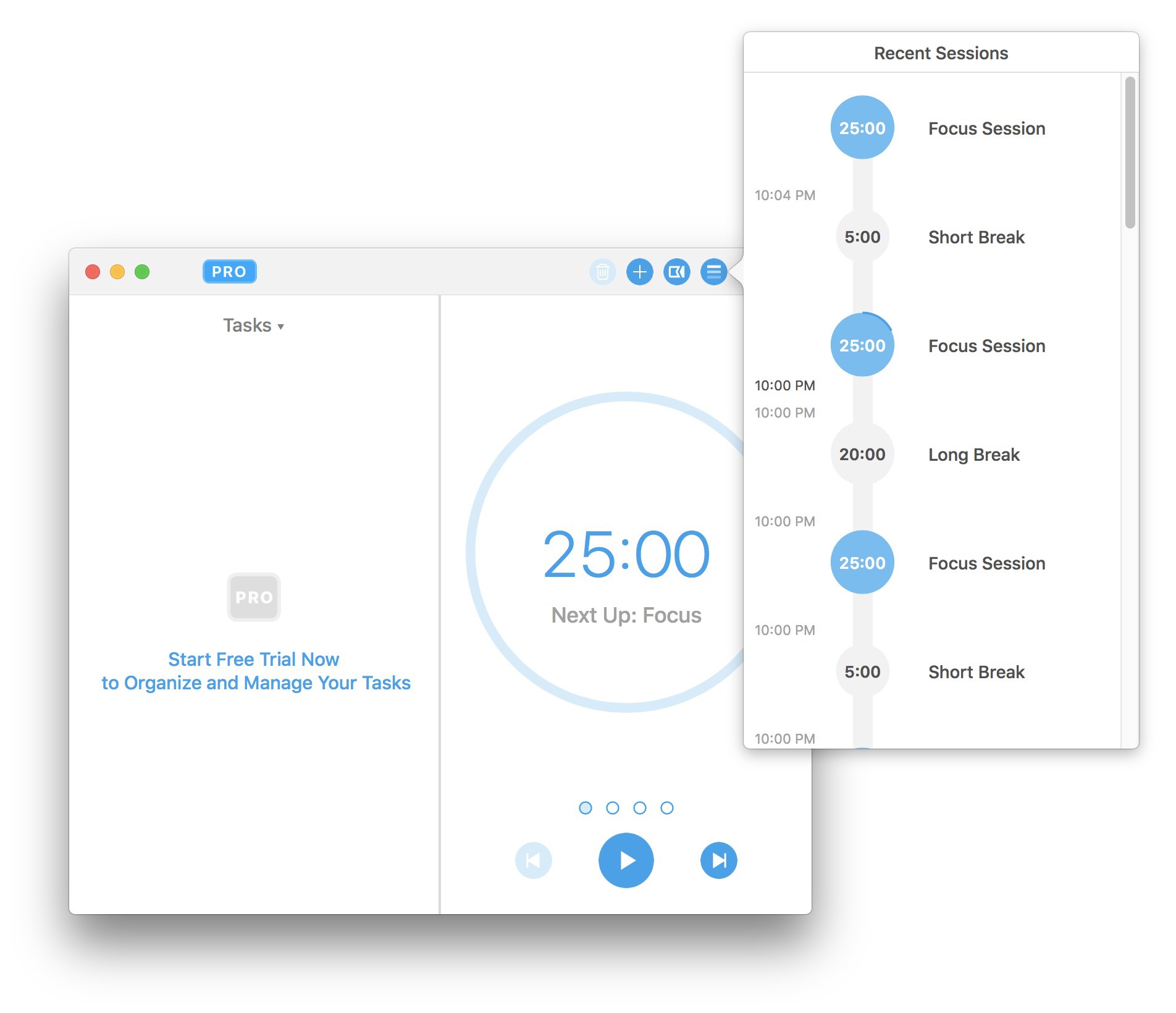 Soustředění je složitá věc. Dost často máme při práci tendence prokrastinovat, nebo se soustředit jen napůl, či jen krátkou chvíli. Zejména ti, co tíhnou k technice, potřebují často nějakou „geekovskou“ motivaci. Z toho vychází aplikace Focus, která vám pomáhá při práci tím, že stanovuje dobu pro soustředění a dobu pro přestávky. Mnoho studií potvrzuje trend, kdy správný přístup k plnění zejména složitějších pracovních úkolů vyžadujících koncentraci a kreativitu je si čas rozdělit do kratších pracovních úseků oddělených přestávkami. Ideální je přitom období 25 minut soustředění a pětiminutová přestávka. Tím dosáhnete za hodinu ideálního poměru, kdy by šestina doby na soustředění měla být přestávkou.