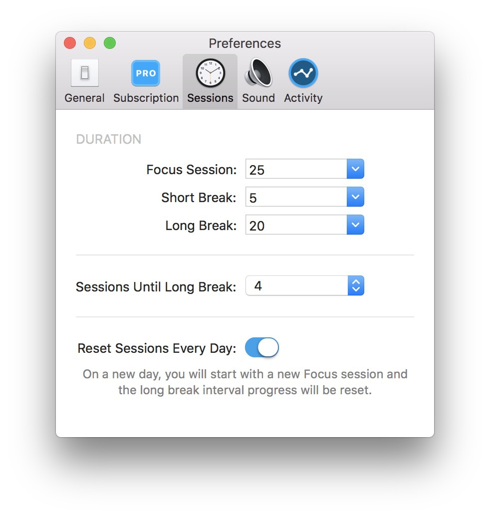 Nejprve se tedy podívejme na nastavení aplikace. Na kartě Settings si otevřeme tlačítko Sessions, kde se objeví podrobné nastavení pro jednotlivé úseky. Nastavujete si, jak dlouho chcete na práci, jak má být dlouhá přestávka a kolik cyklů je před dlouhou přestávkou a jak dlouhá má vlastně být. Dále doporučujeme si zvolit nějaký líbivý zvuk, to provedete pod tlačítkem Sounds. Zvuků je k dispozici několik, každý by si měl vybrat takový, který ho upozorní, ale nevyruší moc. Nastavit si můžete ještě denní cíl, pod tlačítkem Activity se ukrývá nastavení denního cíle v počtu cyklů, po jeho splnění vám aplikace oznámí, že jste pro dnešek dosáhli svého denního cíle.