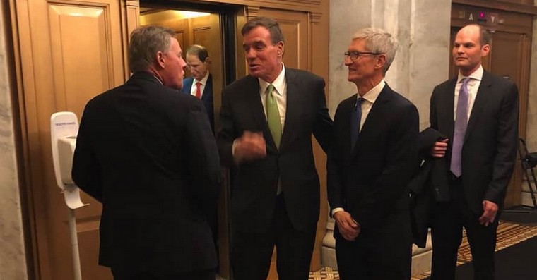 Frank Thorp z NBC News pořídil fotografii, na které je Tim Cook, Mark Warner a Richard Burr, který vedl vyšetřování údajného ruského zásahu do amerických voleb v roce 2016. Cook a technicky zdatný Warner mají společné zájmy, pokud se jedná o téma soukromí.