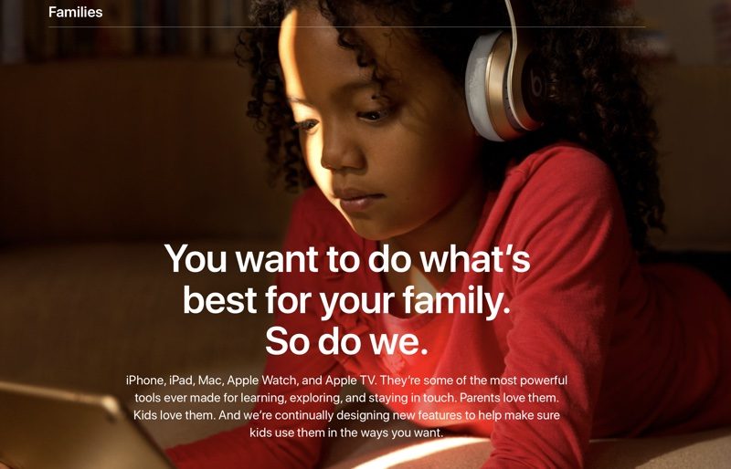 Začátkem letošního roku investoři vyzvali cupertinskou společnost, aby se začala více zabývat závislostí dětí na chytrých telefonech. Apple proto přidal na svou webovou stránku sekci Families, která popisuje nástroje rodičovské kontroly a informuje, o čem by měli rodiče ohledně závislosti ratolestí na smartphonech vědět.