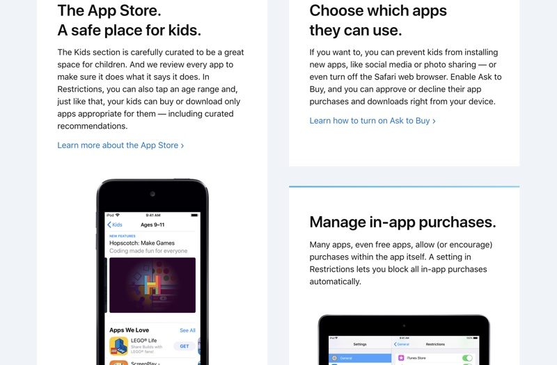 Jedná se o mini stránku rozdělenou do několika základních sekcí, přičemž v každé sekci jsou zdůrazněny funkce. Apple například zavedl různá doporučení pro aplikace, nastavil omezení aplikací ke stažení a vytvořil nástroje pro omezení internetu.