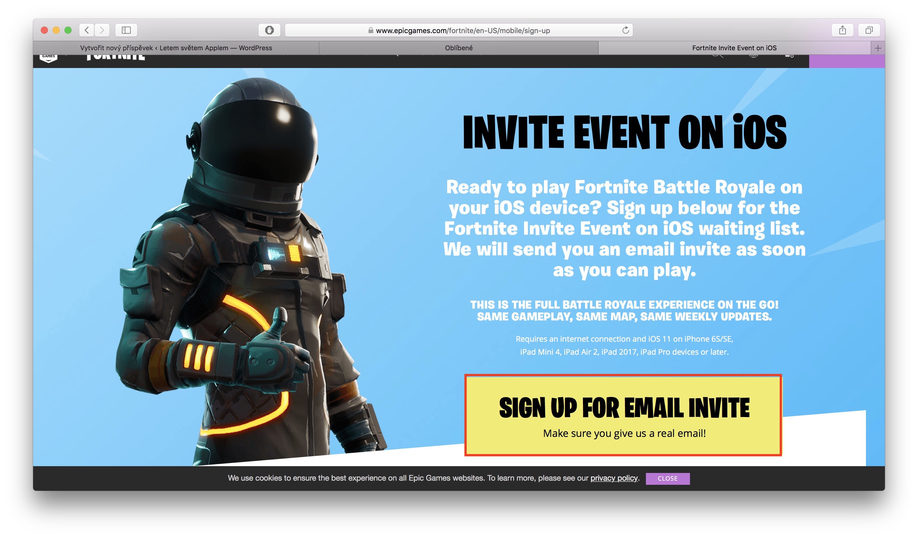 Na závěr bych ještě dodal pár informaci, které byste měli před registrací vědět. Abyste se mohli přihlásit do betaverze Fortnite pro iOS, je nutné vlastnit tato nebo novější zařízení s iOS 11: iPhone 6S/SE, iPad Mini 4, iPad Air 2, iPad 2017, iPad Pro. Na starších zařízeních už si Fortnite bohužel nezahrajete. Pokud vlastníte telefon s OS Android, tak nezoufejte – i pro Android se hra připravuje, jen vyjde později, než na iOS.