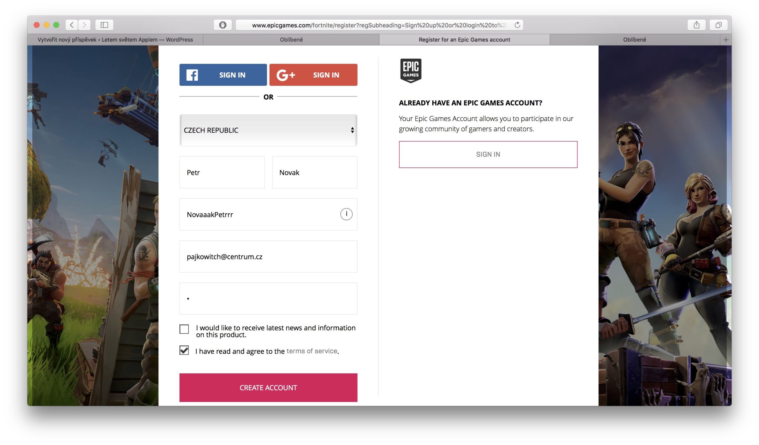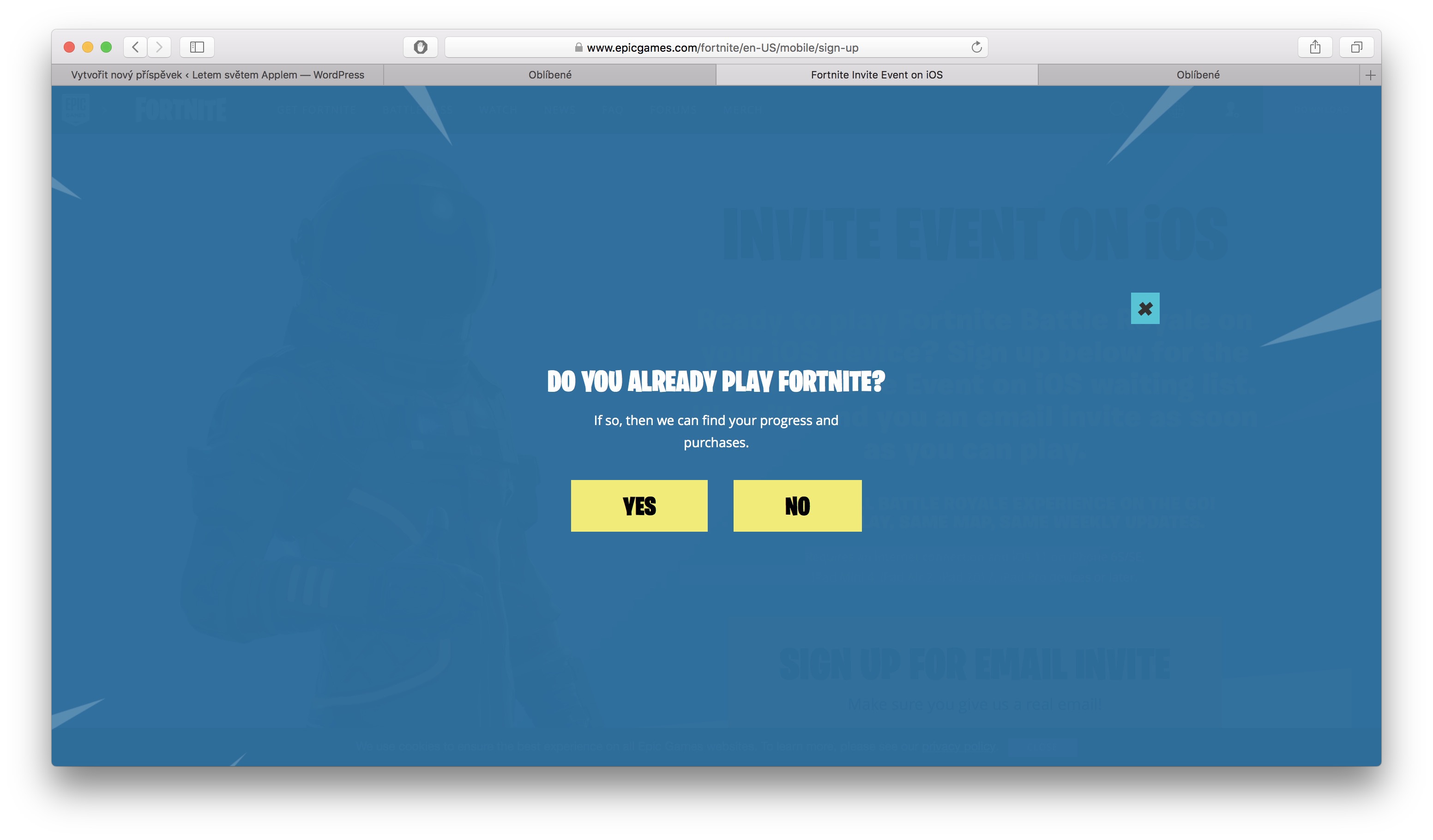 Nejprve je třeba přesunout se na stránky Epic Games. Učiníte tak kliknutím zde. Necháme chvilku stránku načíst a poté v levém horním rohu klikneme na panáčka s textem Inive Event on iOS – Sign Up Now. Po kliknutí na žluté tlačítko nás stránka přesměruje dále, kde je opět nutné kliknout na žluté tlačítko Sign Up for E-mail Invite. Poté se vás stránka zeptá, zda-li už jste někdy Fortnite hráli. Postup se nijakým způsobem neliší, já jsem pro ukázku ale zvolil možnost No. Stránka vás po chvilce přesměruje na formulář, kde se registrujete do hry. Stačí vypsat veškeré údaje a poté kliknout na růžové tlačítko Create Account. Nyní už se dostáváme k samotné aplikaci do betaverze. Na nyní zobrazené stránce vybereme, jaké vlastníme iOS zařízení. Vybereme a klikneme na Select. Stránka nám poté napíše, že jsme ve frontě a musíme počkat na e-mail. To je vše, nyní už jen stačí počkat, dokud na vás nevyjde řada a nepřijde vám e-mail s pozvánkou. Pamatujte, že čím dříve, tím lépe.